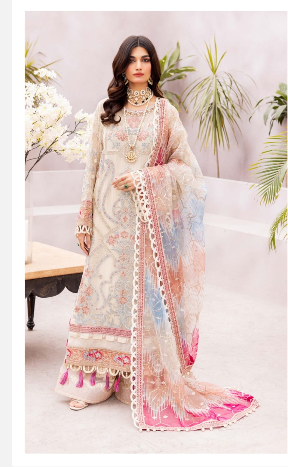 Description: pure chiffon suit with embroidery/ sequins work and heavy organza worked dupatta