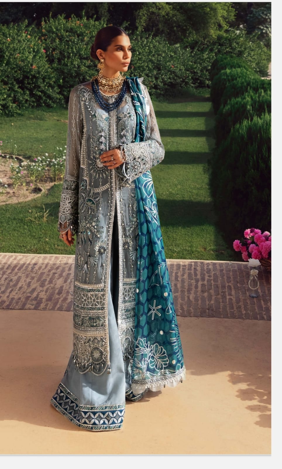 Pure chiffon suit with handwork and embroidery, crepe bottom and organza hand paint dupatta