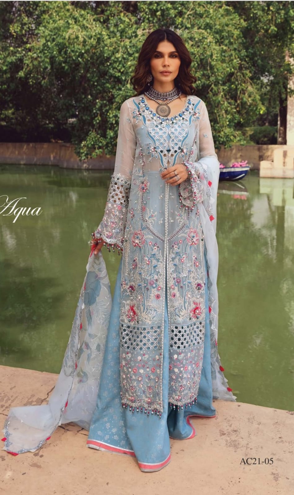 Pure chiffon suit with handwork and embroidery, crepe bottom and organza applique worked dupatta