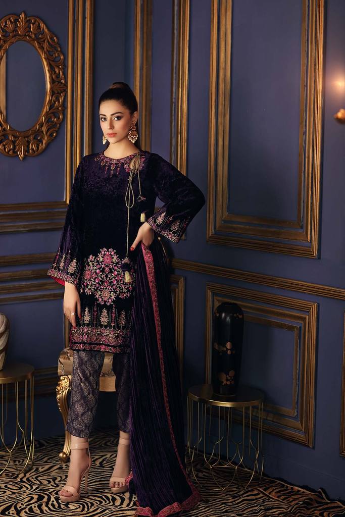3 pc unstitched Salwar Kameez –  embroidered velvet kameez with embroidered velvet shawl and jacquard velvet trousers
