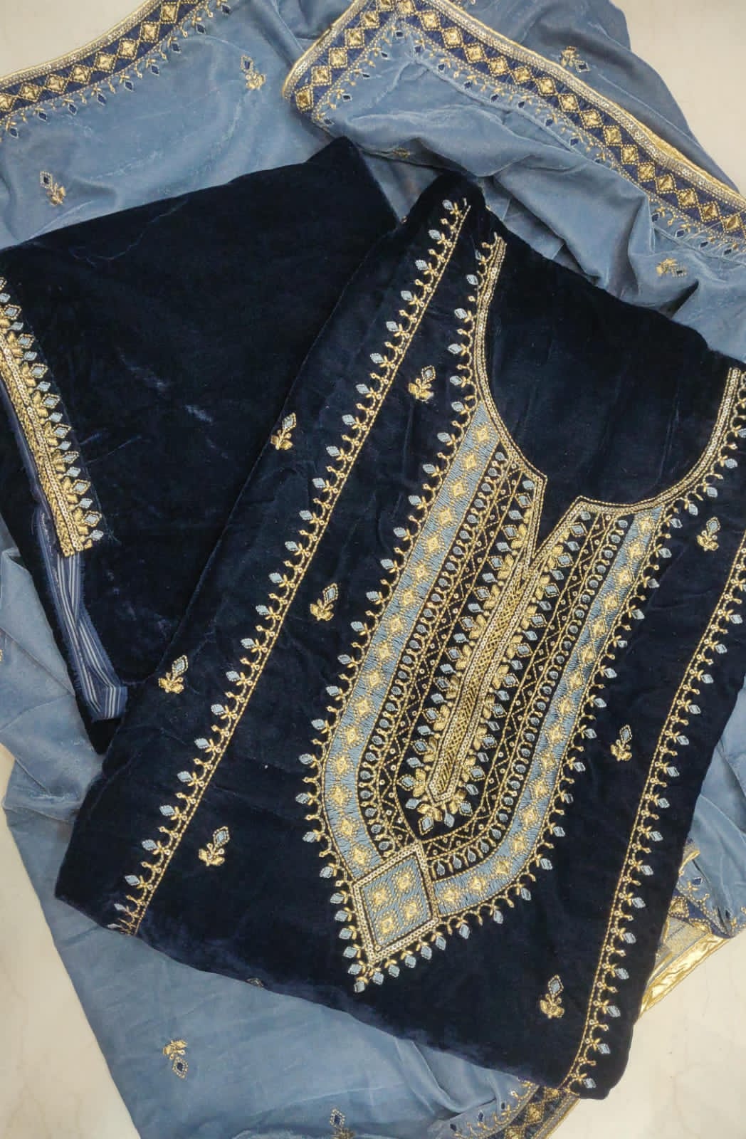 Velvet suit with zari thread work and velvet shawl dupatta