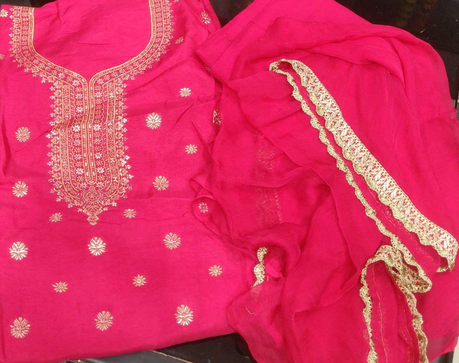 Banarsi silk suit with zari thread work neckline and chiffon dupatta with lace work