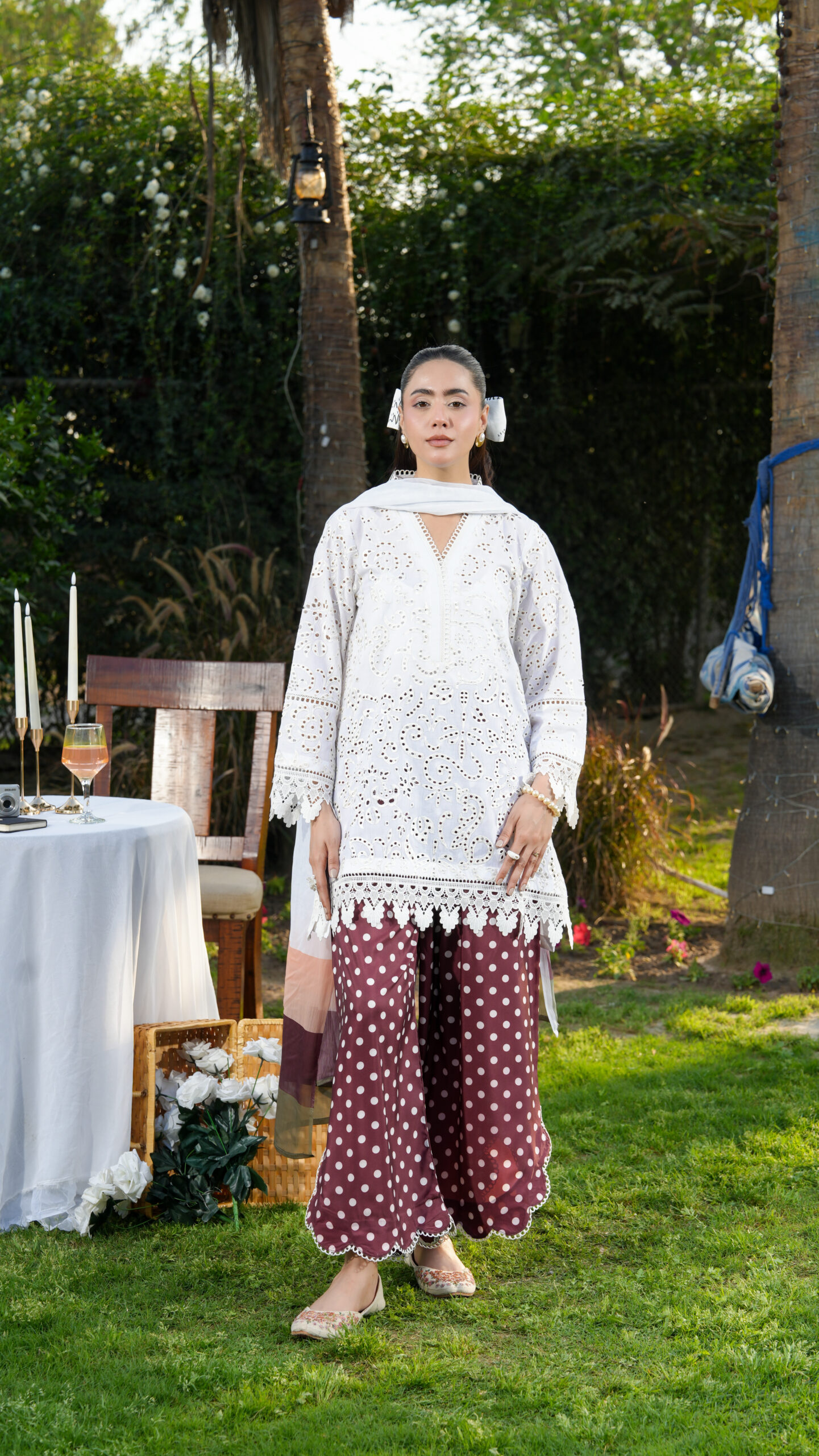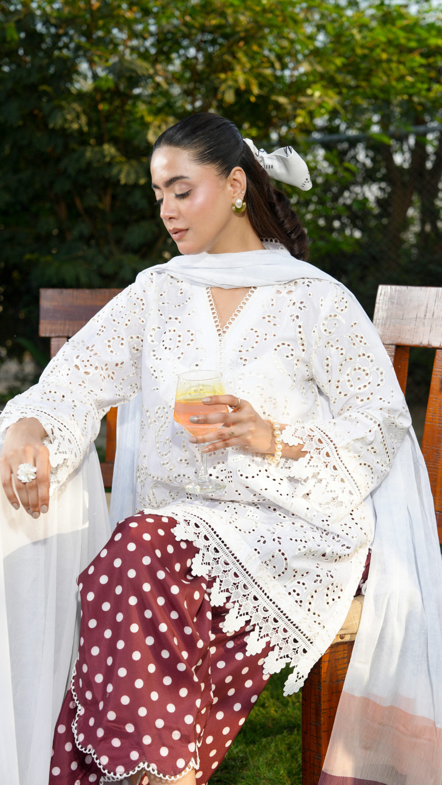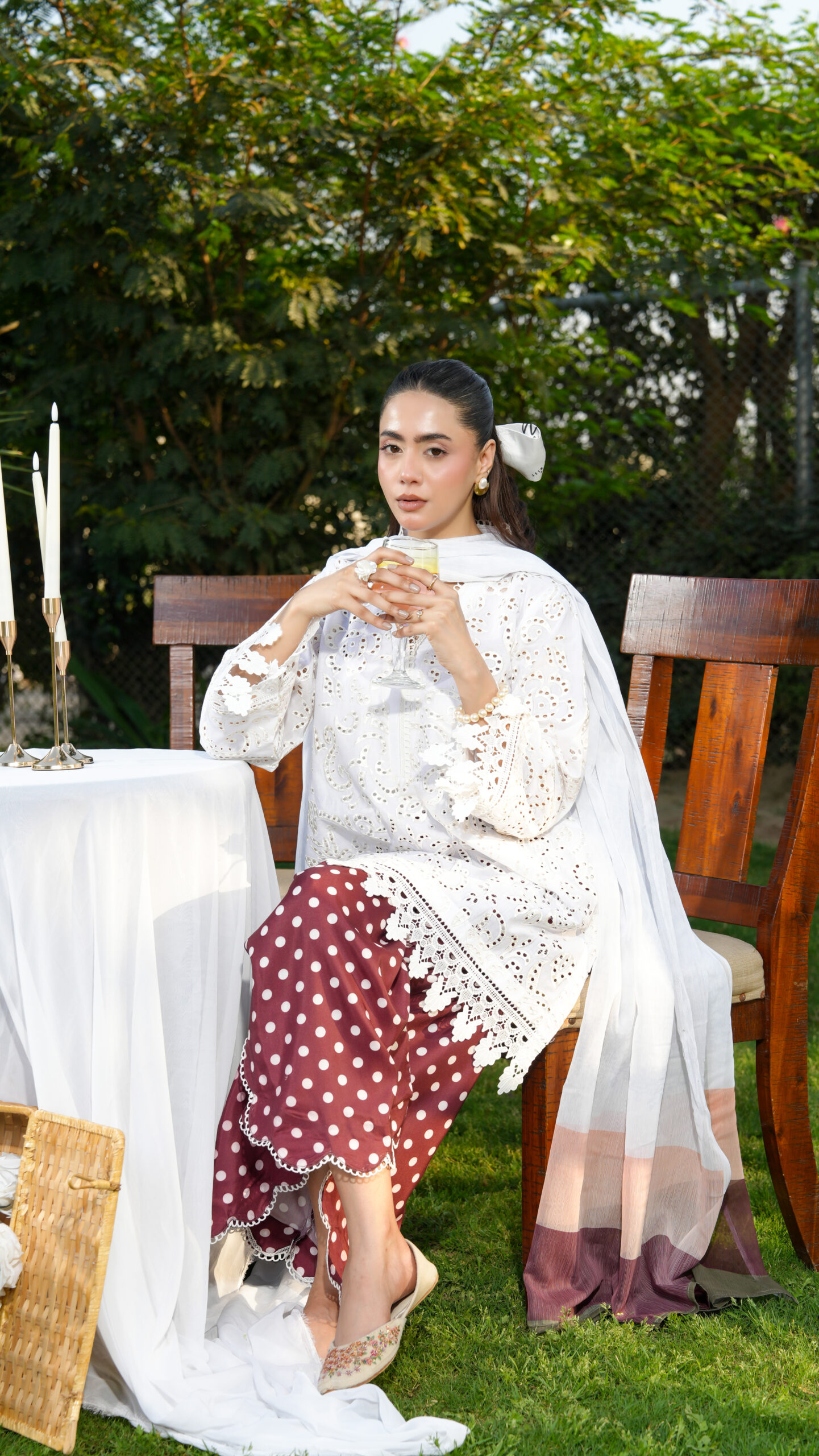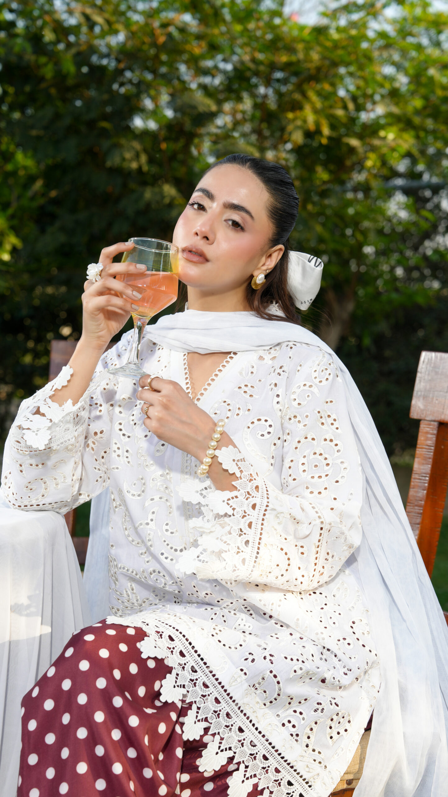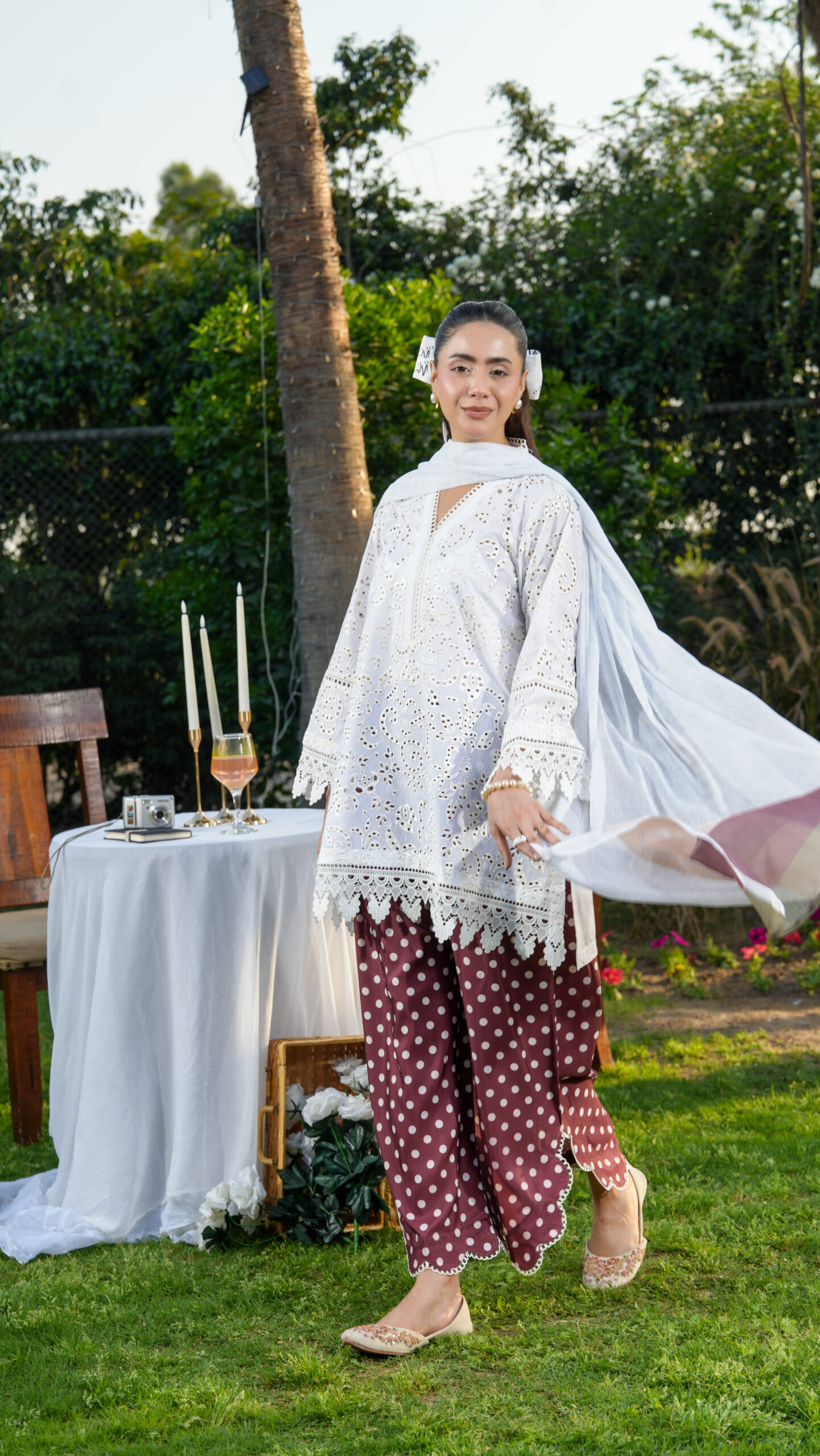 A delicate white embroidered kurta, paired with maroon polka-dot trousers Styled with a lightweight chiffon dupatta for an elegant and breezy garden-soiree look.