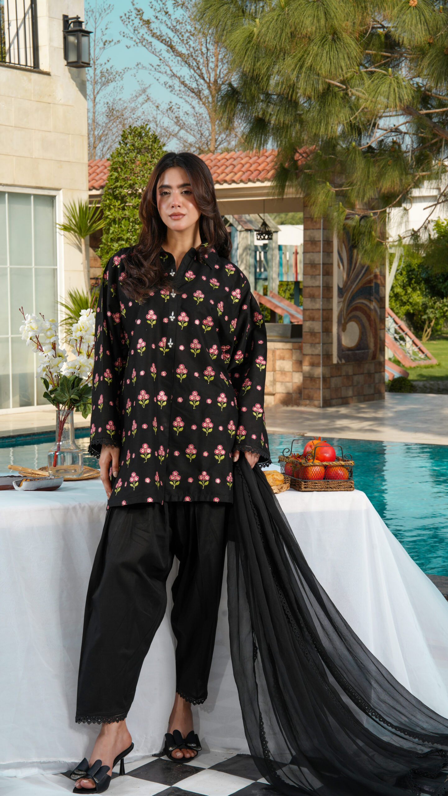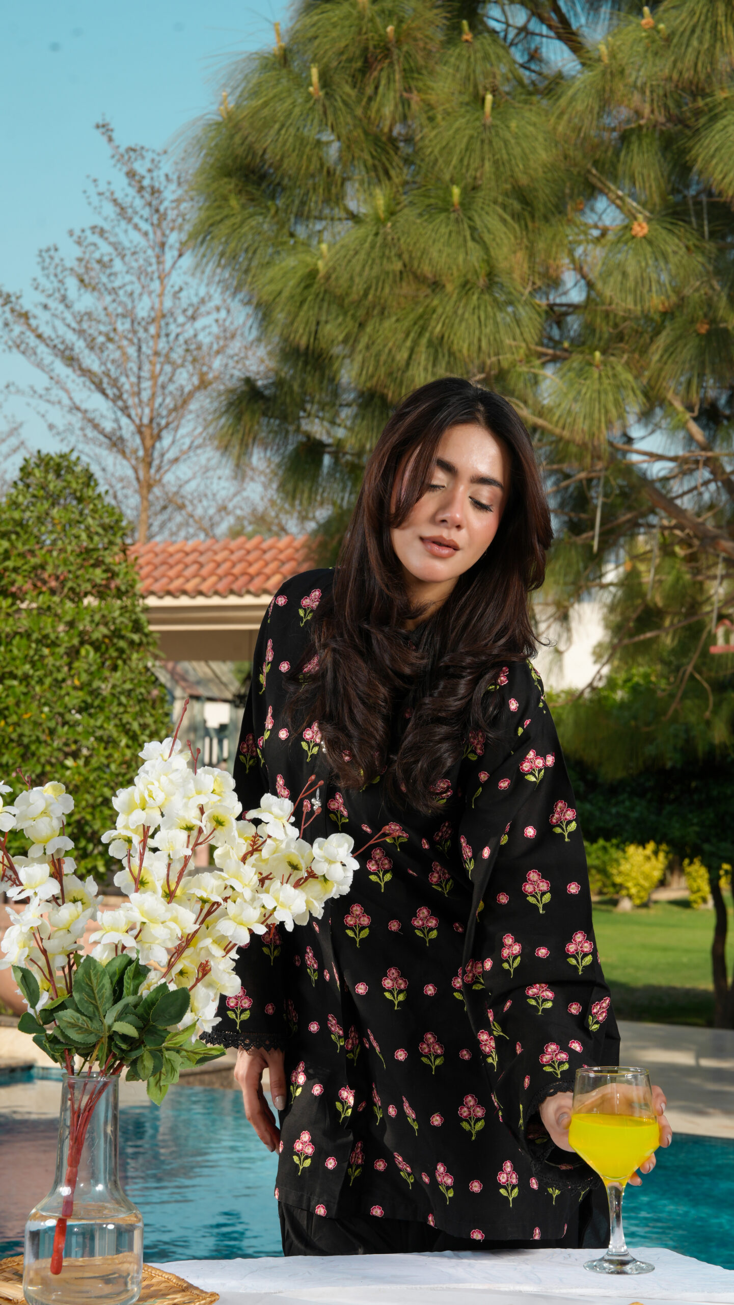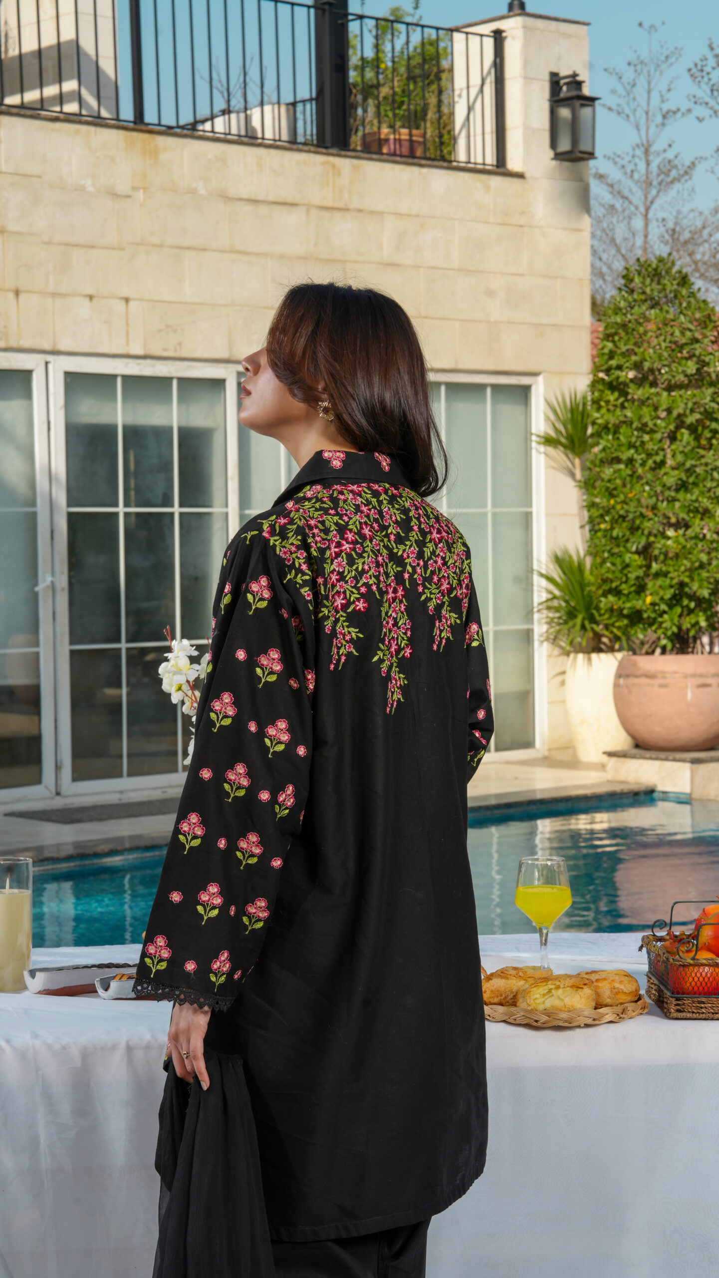 A black kurta adorned with delicate pink floral embroidery, featuring a relaxed silhouette and full sleeves for an elegant look.