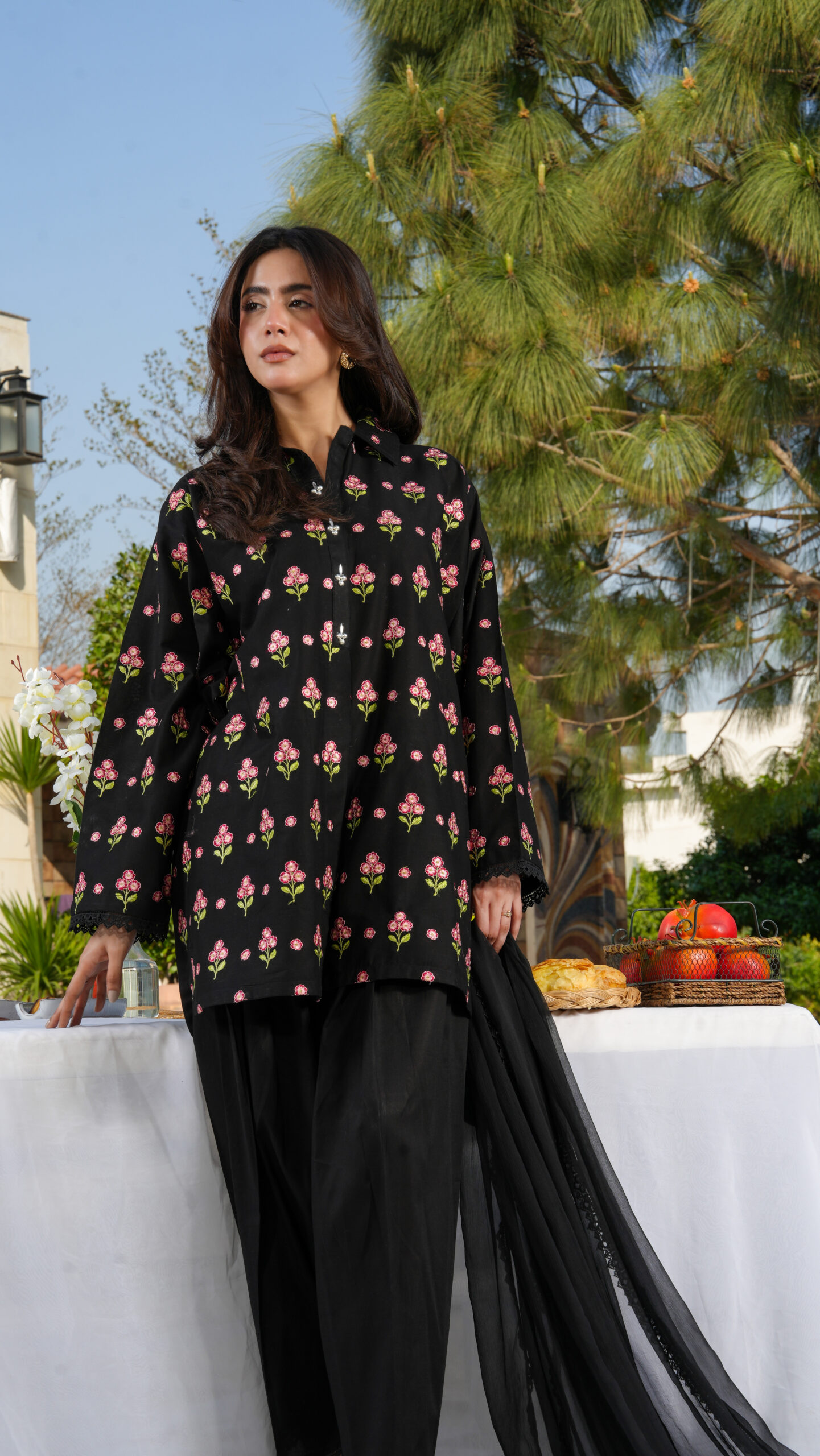 It’s paired with wide-leg black pants and a sheer dupatta with subtle lace detailing, adding a graceful, refined touch.