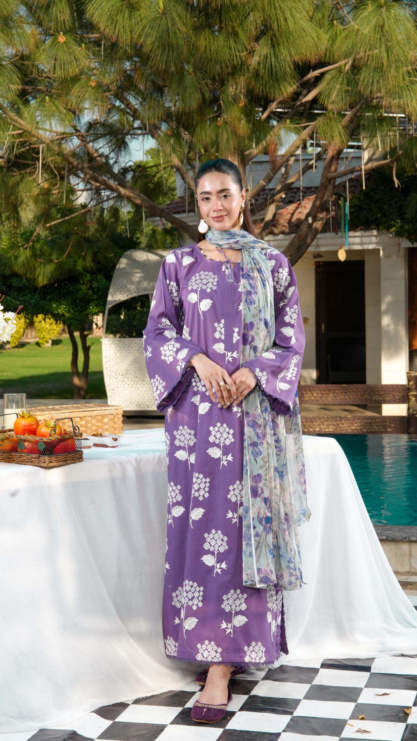 Paired with matching trousers and a soft floral chiffon dupatta, creating a breezy and refined ensemble.