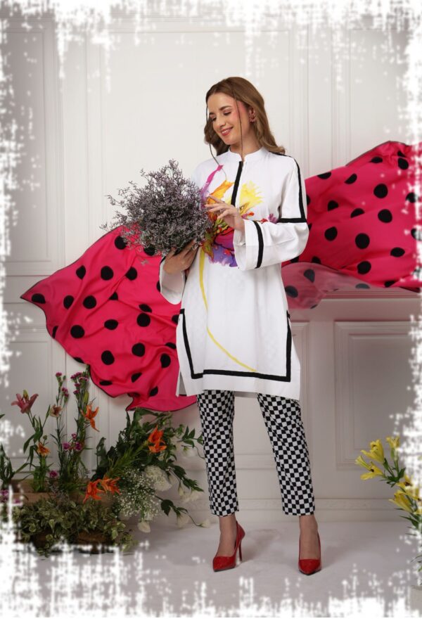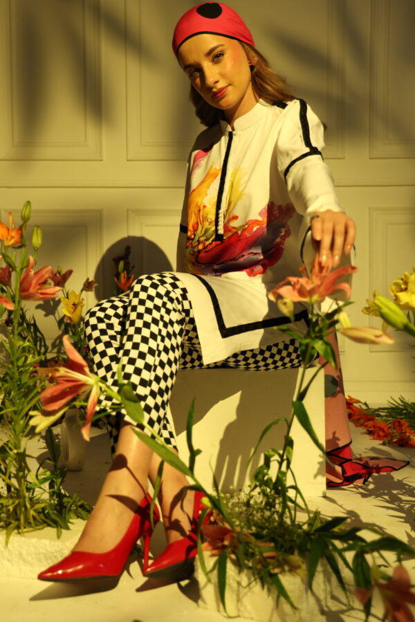 A lively mix of modern prints — a white shirt with vivid floral print, paired with checkered trousers, Finished with a pink polka-dot shawl.