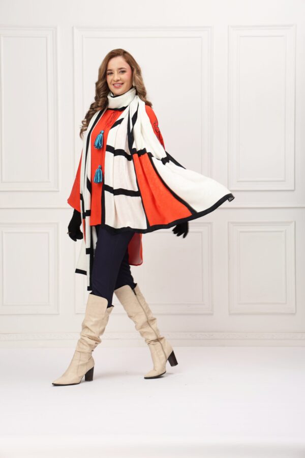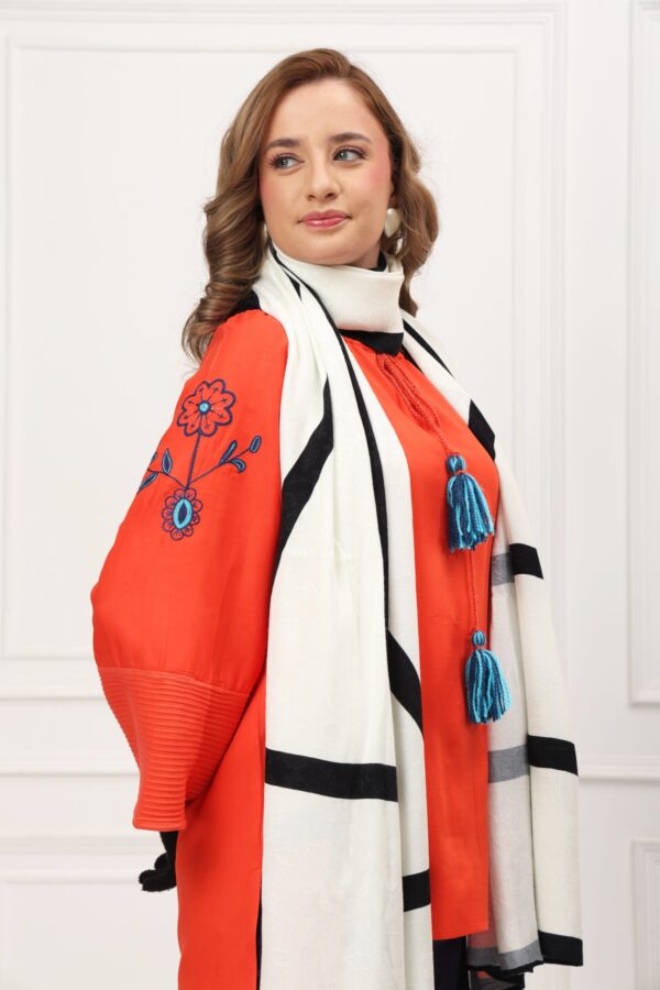 A vibrant Shirt with woolen tassel detailing, paired with navy trousers and a bold monochrome shawl. A chic fusion of color and pattern, perfect for cozy winter days.
