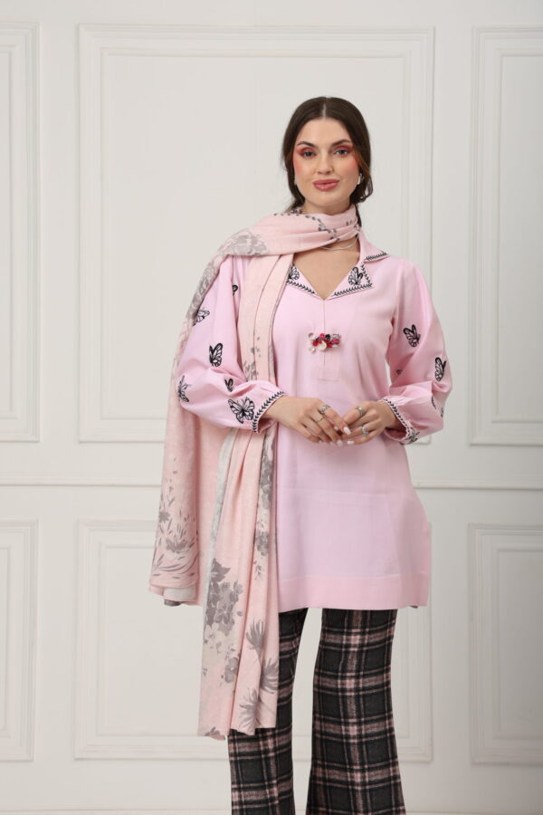A soft blush pink Shirt adorned with delicate embroidery, paired with plaid trousers and a floral printed dupatta. A playful yet elegant ensemble, perfect for casual winter charm.