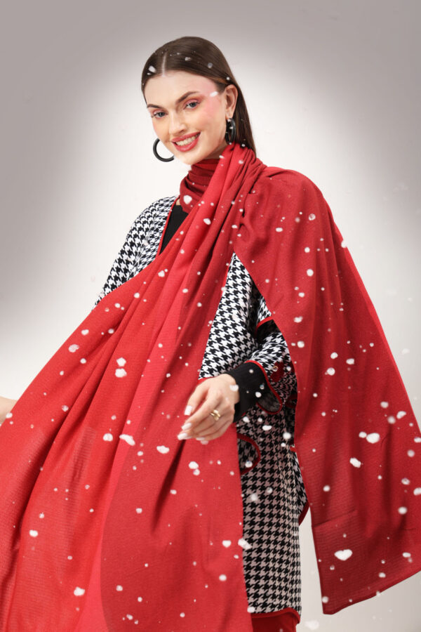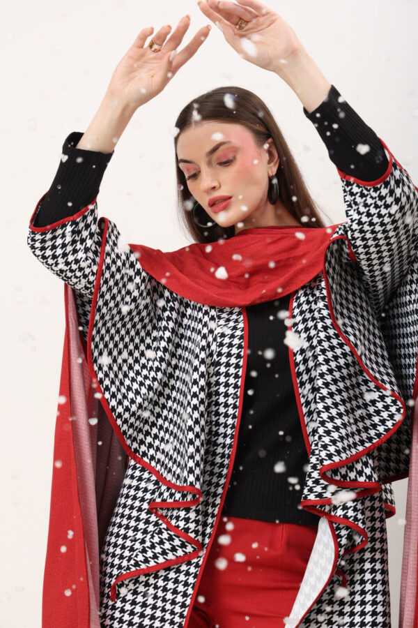 A monochrome houndstooth shirt paired with striking scarlet trousers, effortlessly finished with a vivid red shawl. This ensemble radiates modern confidence and timeless winter charm.